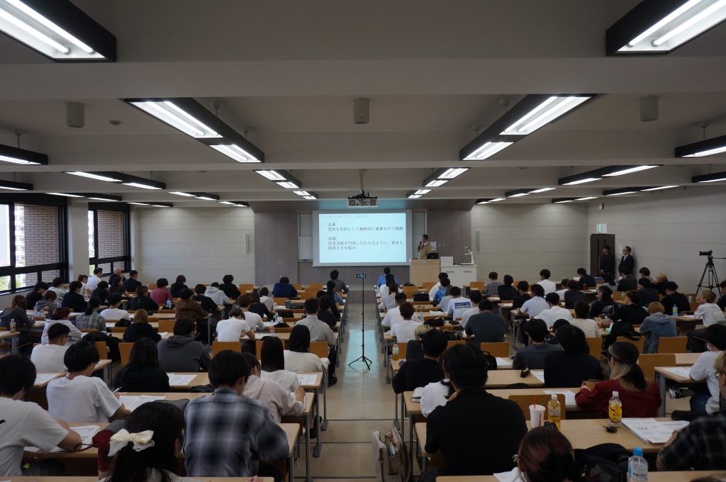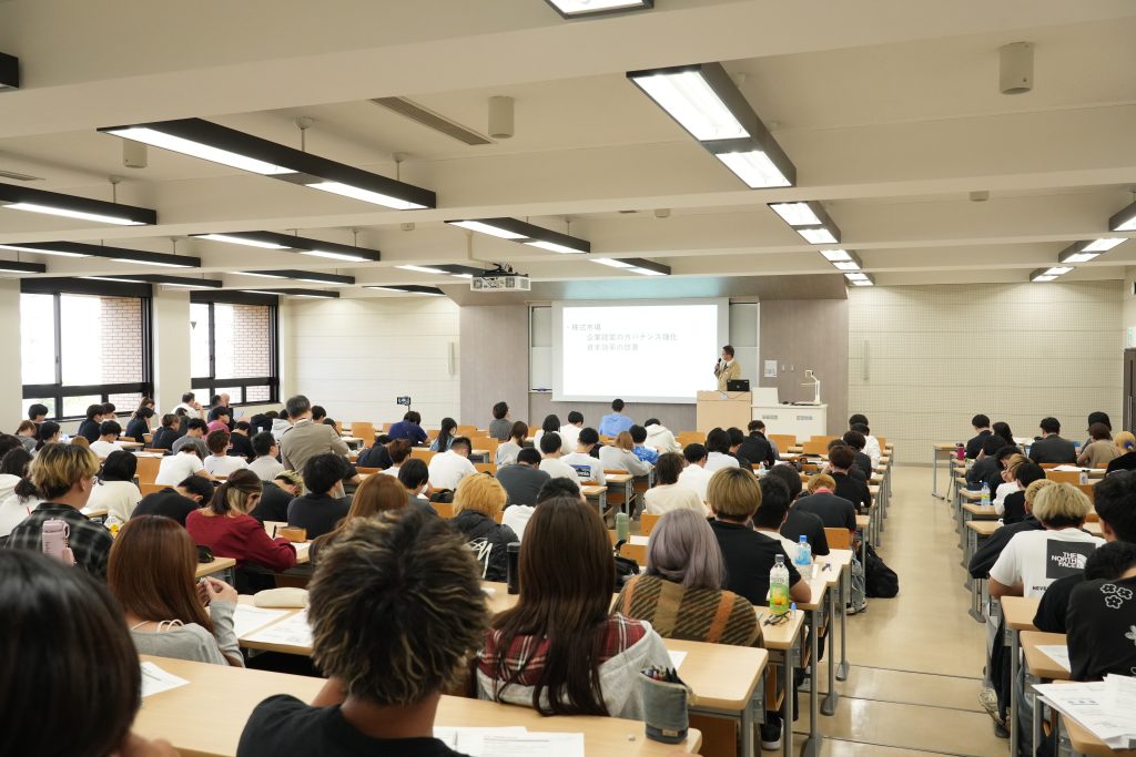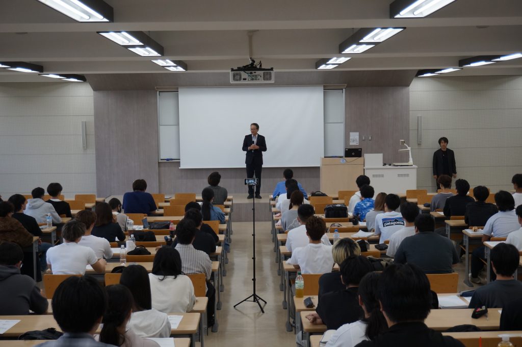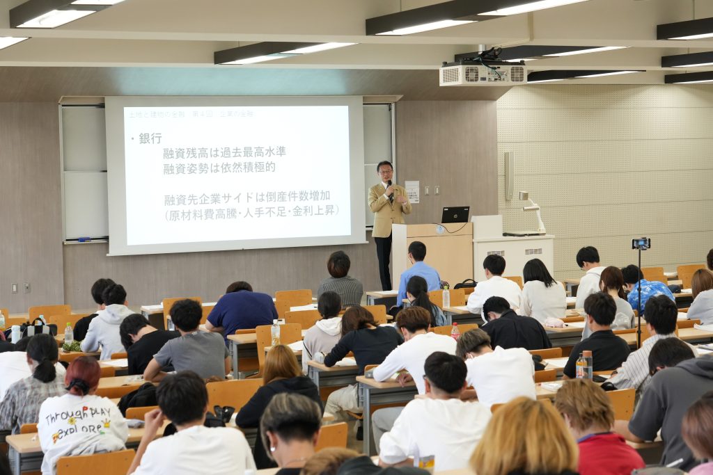 2025年10月8日(水)、1年生の不動産学6学群必修科目である「土地と建物の金融」授業(担当:藤木亮介先生、上地聡子先生、雨夜真規子先生、金東煥先生)では、産学連携活動に関する協定を締結した株式会社センチュリー21・ジャパンの実務家(園田 陽一顧問:前取締役社長)の特別講義がありました。、不動産業界における実際開発関連のお話を聞く貴重な時間を設けました。