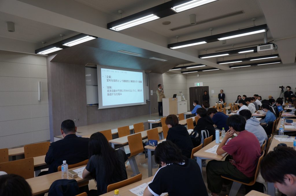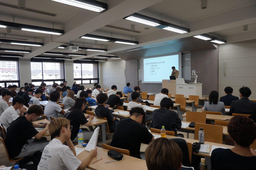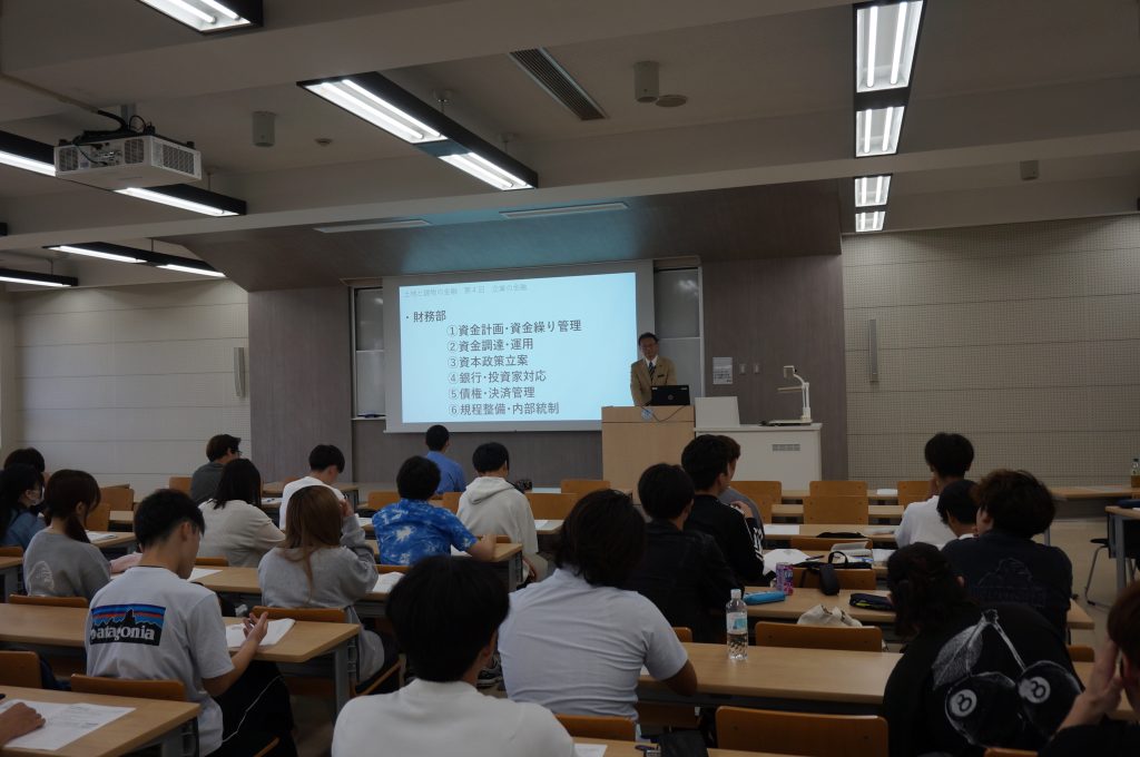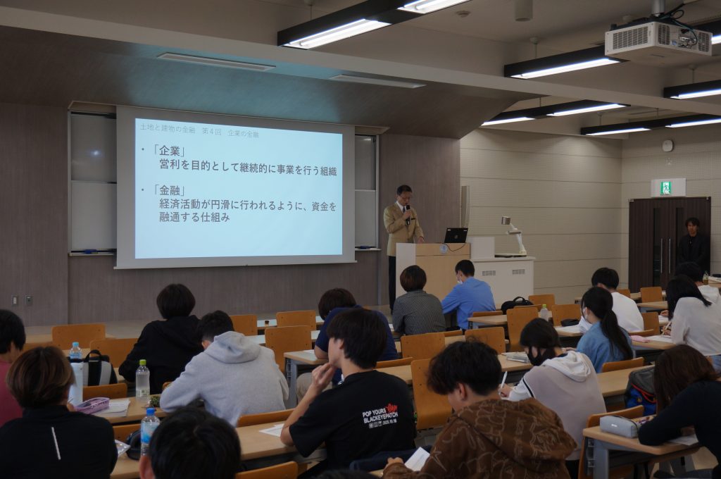 講義は、中城学部長先生のご挨拶から始まり、園田顧問は、「企業の金融」というタイトルで、不動産企業が触れている金融について、実務家の立場で、詳細に講義していただきました。加えて、オランダ東インド会社からスタートしたコーポレートファイナンスなど非常に興味深い実務家の特別講義でした。1年生の方々には、不動産関連の金融について、多くの質問をするなど、現場のお話を聞くことができる貴重な時間でした。授業の様子をお伝えします。