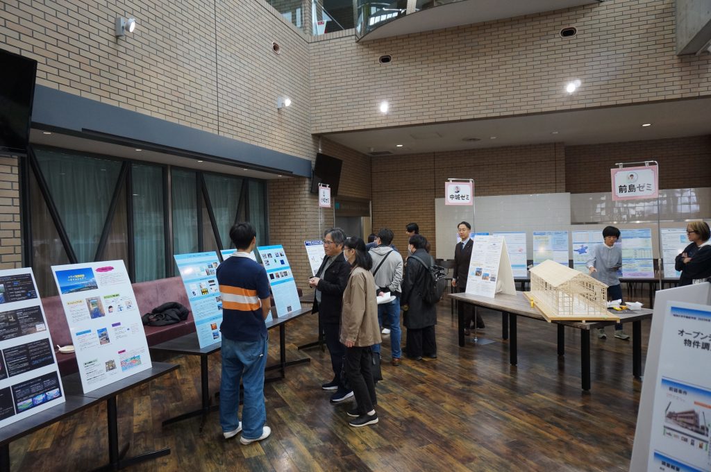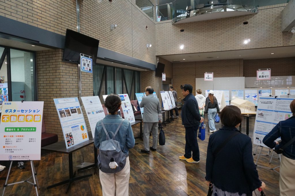 不動産学部は、中城ゼミ、藤木ゼミ、小松ゼミ、前島ゼミ、原野ゼミ、金ゼミ、麻ゼミ、館山プロジェクト、ハワイ研修チームの学生がポスターセッションで報告・発表しています。加えて、不動産学部の同窓会緑風会からの「不動産相談会」などで手厚い不動産支援を行っています。