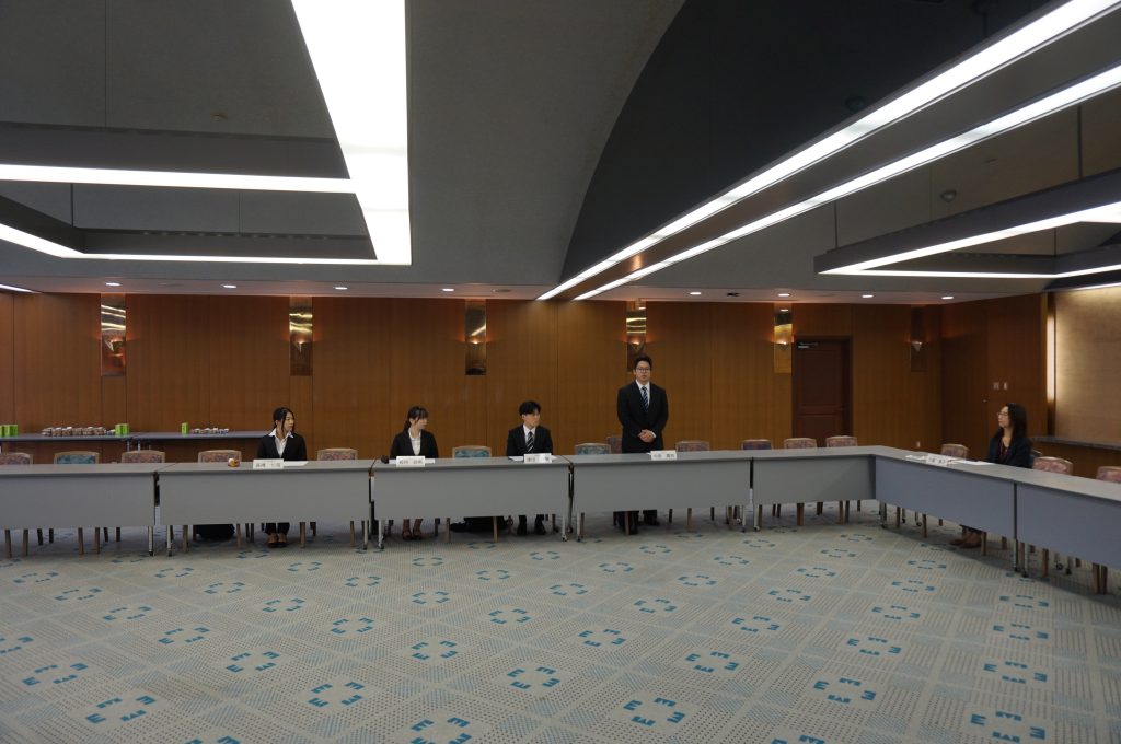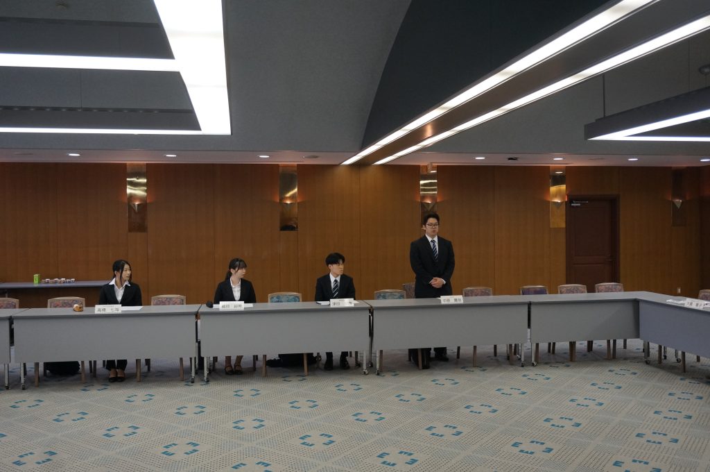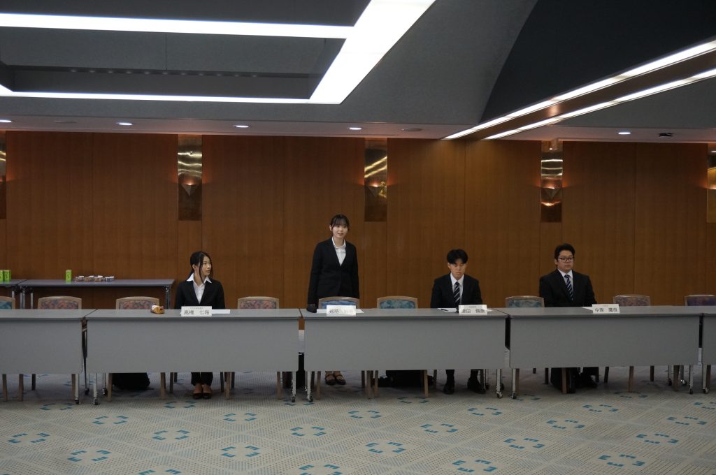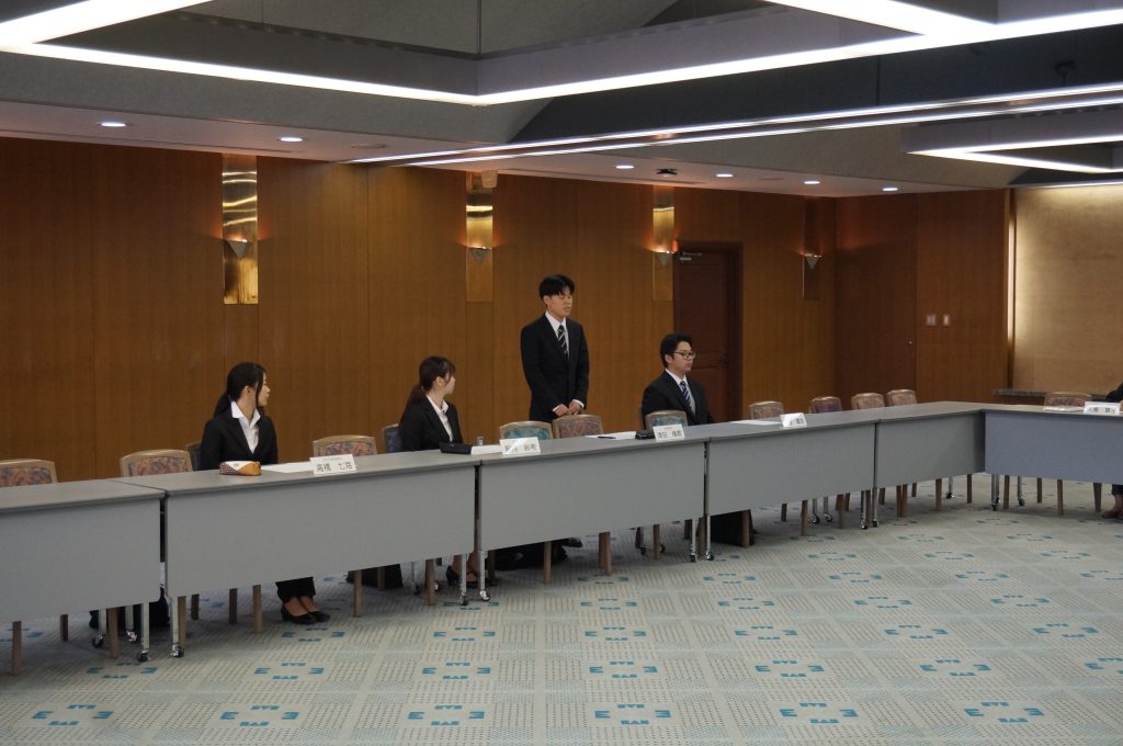 インターンシップ研修機関は「エアロトヨタ」「菊屋商事」「ポラスグループ」「ダイワ不動産鑑定」です。インターンシップ派遣学生は、インターンシップでの経験と学修について説明し、今後の挑戦について報告しました。