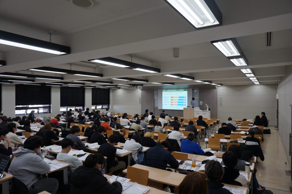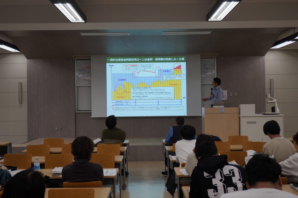 当日、外部講師としては、住宅金融支援機構の中野秀也(千葉センター長)様が担当してくださいました。講義タイトルは、「金利のある世界における住宅ローン」であり、日本銀行の金融正常化が進んでいる現状に照らして、不動産学部の1年生が、不動産金融の知識として、必ず知って置くべき貴重な講義でした。講義後には、学生から多くの質疑応答が行われて、不動産学部学生の金融についての真剣さを確認できる貴重な時間でした。