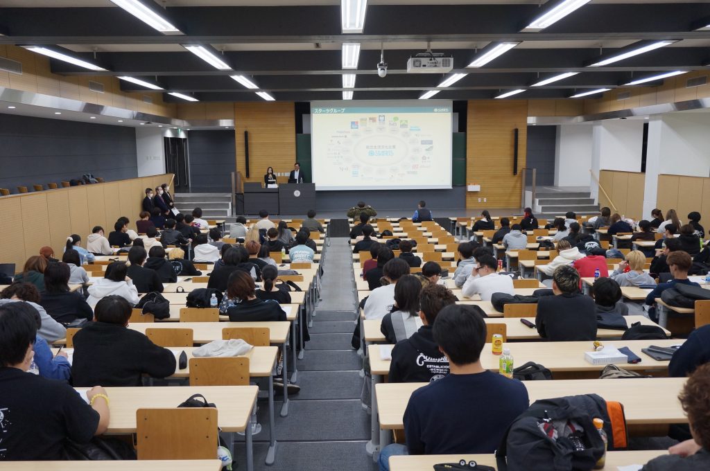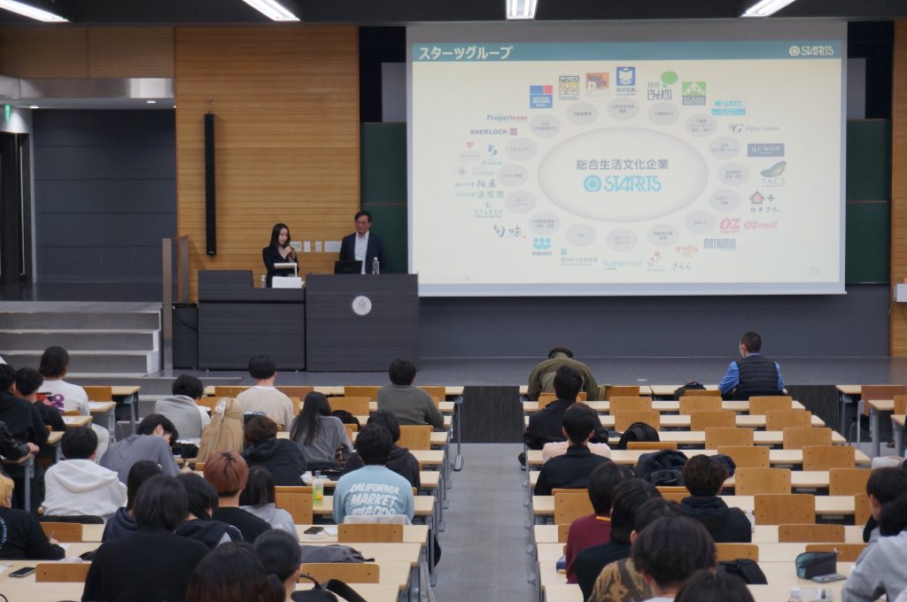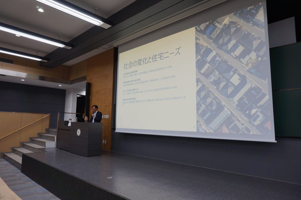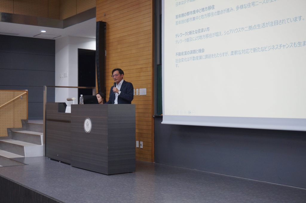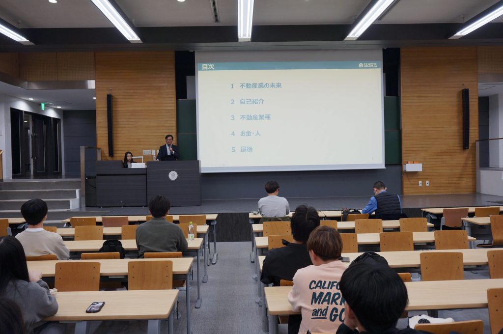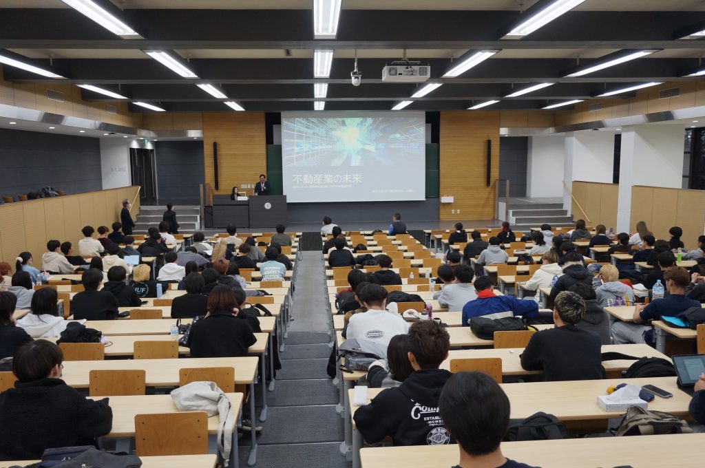2025年12月10日(火)、明海大学不動産学部は、「ライフプランと資産形成(担当教員:杉浦雄策教授/中城康彦教授)」の授業時間を活用して、「不動産業の未来」の2回目ミナーを開催しました。スターツ総合研究所常務取締役の大澤賢一氏が外部講師として講演していただきました。大澤賢一常務取締役は、「革新的技術が導く次世代の不動産業者」というタイトルで講演しました。