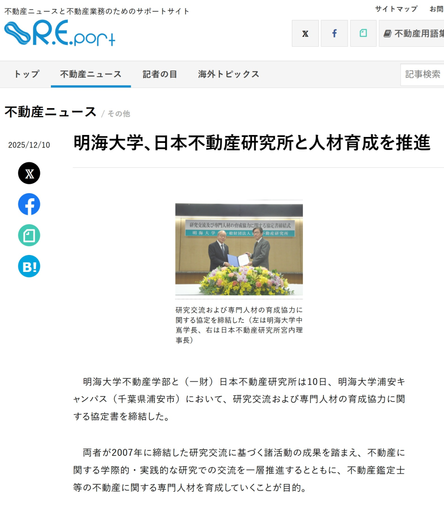 不動産専門紙「月刊不動産流通」2025年12月10日(水)、明海大学不動産学部と(一財)日本不動産研究所がが、研究交流および専門人材の育成協力に関する協定書を締結したことをホームページで報道しました。 詳細はこちらのリンクを参照してください。