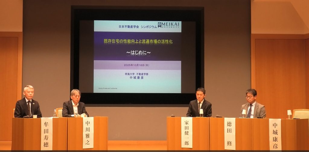 2025年10月16日(木)、公益社団法人日本不動産学会が主催する「日本不動産学会シンポジウム」既存住宅の性能向上と流通市場の活性化が開催(於ける:すまい・るホール)されました。明海大学不動産学部の学部長先生の中城康彦先生が、シンポジウムのコーディネーターを担当していただきました。