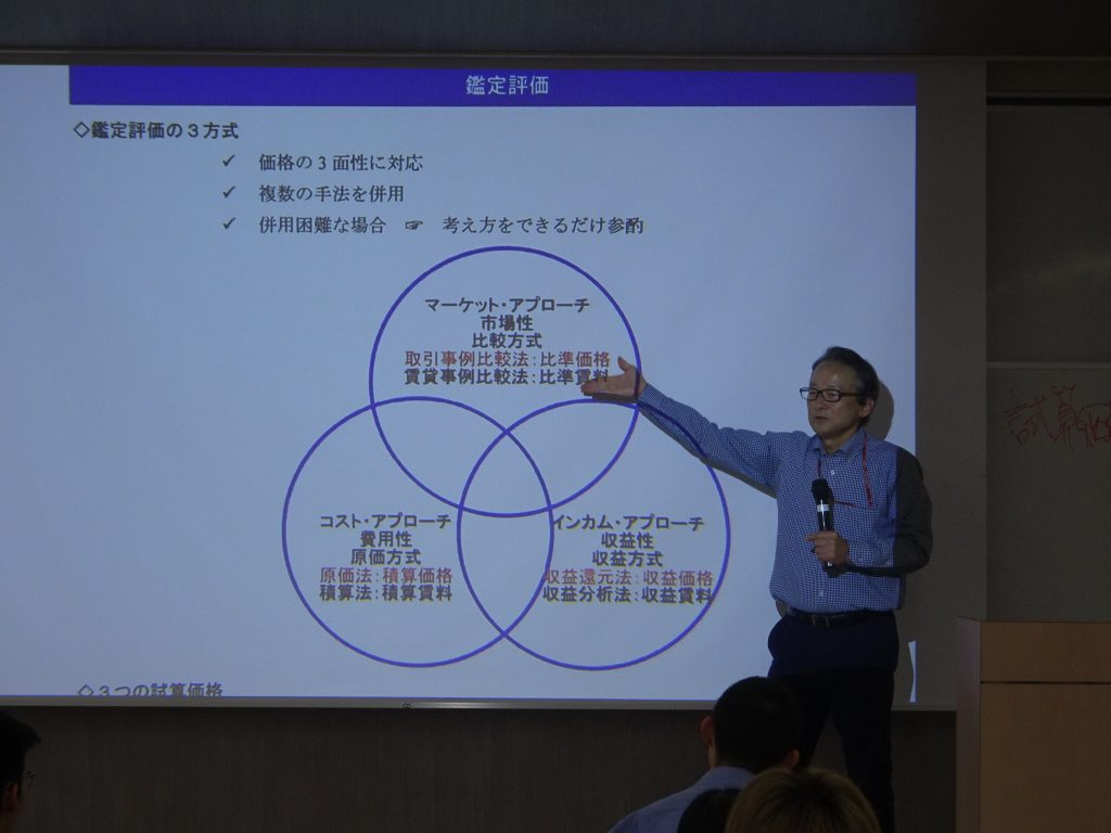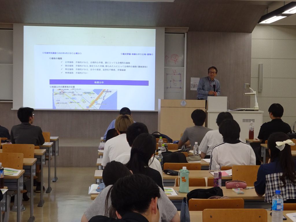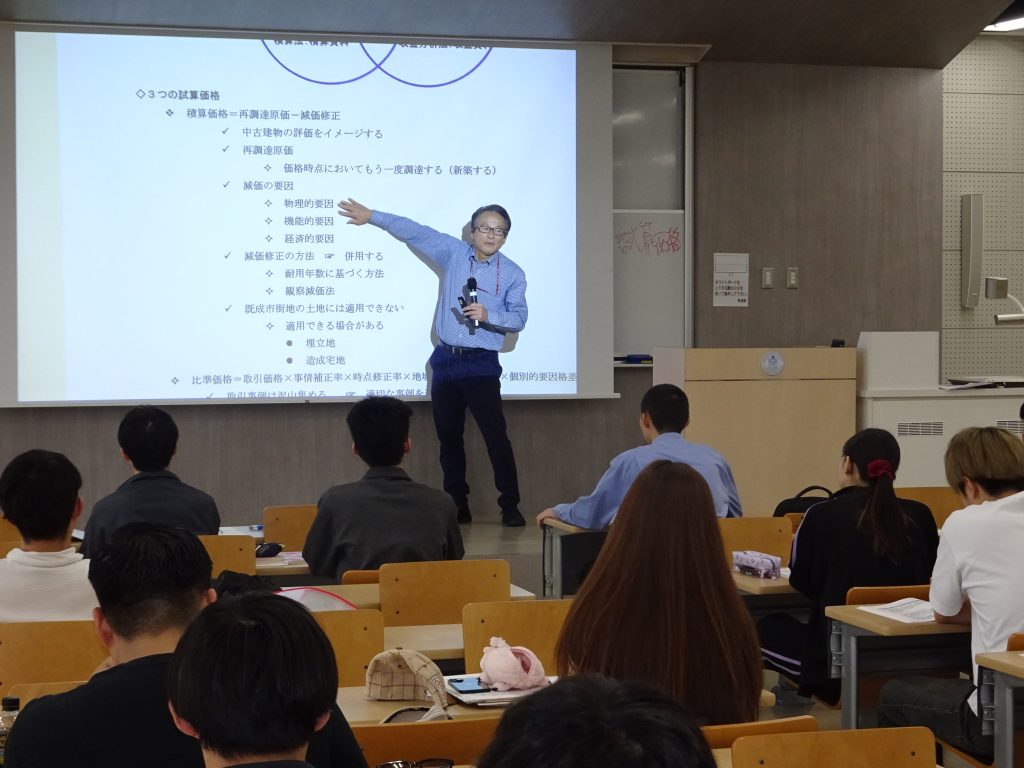 中城学部長による宅建試験直前特別講義が、9月27日(土)の9時から12時までの3時間にわたって実施されました。講義では、本試験での3点アップをめざして、「鑑定評価・土地・建物」の重要ポイントの総整理が行われました。