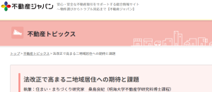 公益財団法人不動産流通センターさんが運営しているサイト「不動産ジャパン」に、大学院(不動産学研究科)の学生の記事が紹介されました。明海大学不動産学研究科博士課程に在学している桑島良紀(住まい・まちづくり研究家)氏は、5月15日、参議院本会議で「広域的地域活性化のための基盤整備に関する法律の一部を改正する法律案」(改正広域的地域活性化法)が可決、成立したことを受け、当該法律案についての解説を加えた記事を執筆し、「不動産ジャパン」に公開されました。当該法律案は、二地域居住を推進する法律案で、テレワークの普及などに伴う、現時代に合った法律案です。詳細は、以下のリンクを参照してください。