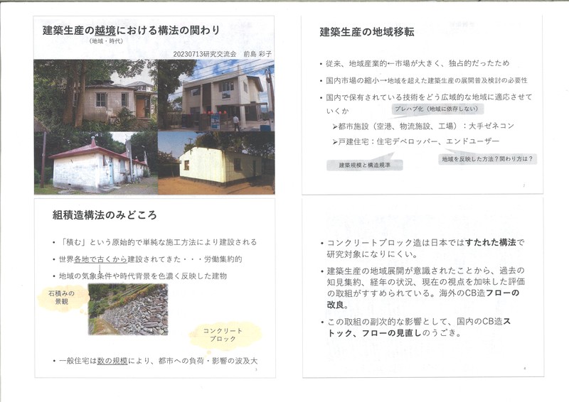 今回の研究交流会では、現在日本ではコンクリートブロック造が すたれた構法であるが、環境負荷の優しさや耐震性などの側面で、海外などで、利用・活用の余地が多いことを知ることができました。また、多くの先生から「コンクリートブロック造」について、質疑応答が行われ、非常に有益な研究交流会でした。