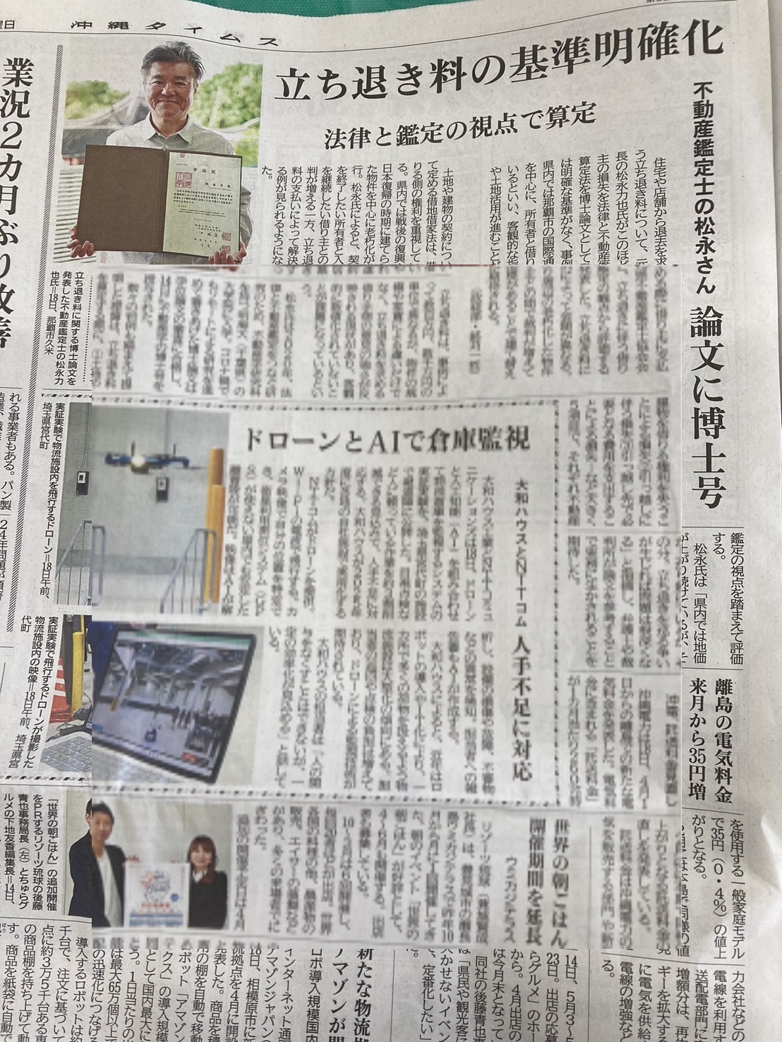 お知らせ 3月19日の「沖縄タイムス」に不動産学研究科博士課程を卒業した「松永力也」さんの記事が掲載されました。 2024.04.02 3月19日の「沖縄タイムス」に不動産学研究科博士課程を卒業した「松永力也」さんの記事が載ってました。 不動産鑑定士である松永力也さんは、2024年3月14日、明海大学不動産学部で、博士号を修得し、法律と鑑定の視点での研究と実務をしています。 引き続き明海大学不動産学部出身であることに誇りを持って、ご活躍してください。応援します。