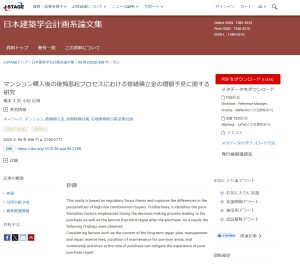 お知らせ 大学院生の審査付き論文、日本建築学会計画系論文集 (90巻838号)に掲載! 2025.12.01 大学院博士後期課程2年の橋本丈次さん(指導教員:小松広明教授)の審査付き論文が、日本建築学会計画系論文集 (90巻838号)に掲載されました。 論文の題目は以下のとおりです。是非ご覧ください。 「 マンション購入後の後悔惹起プロセスにおける修繕積立金の増額予見に関する研究 」 https://doi.org/10.3130/aija.90.276