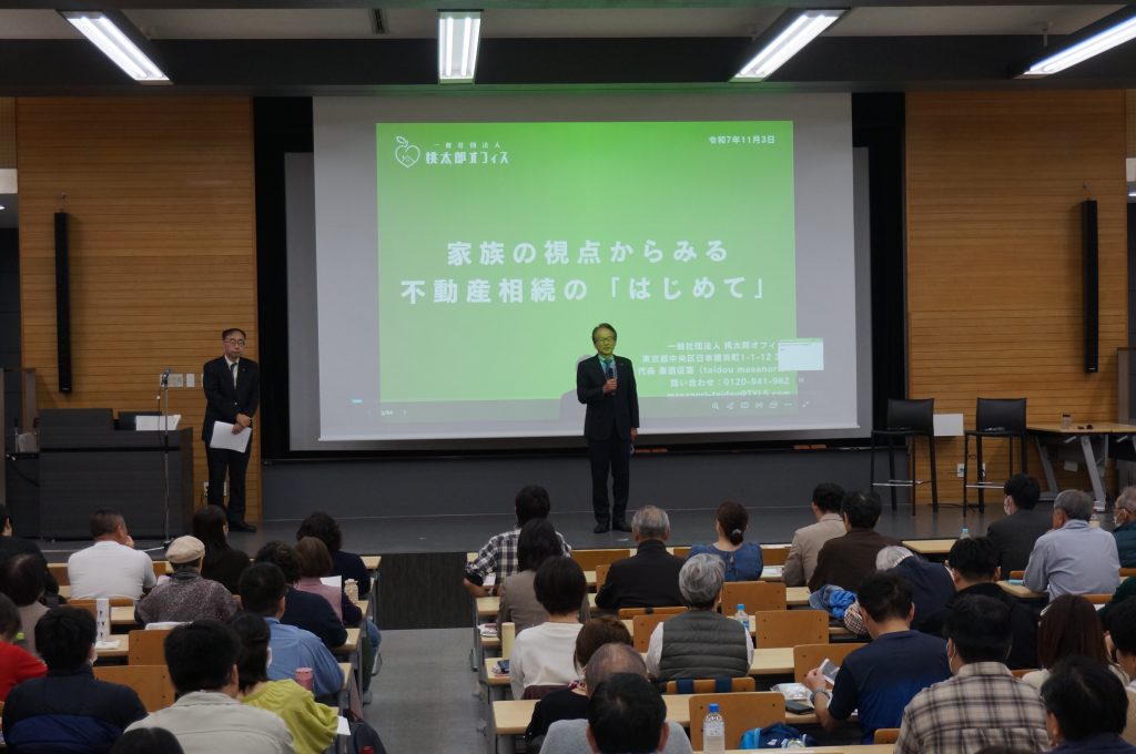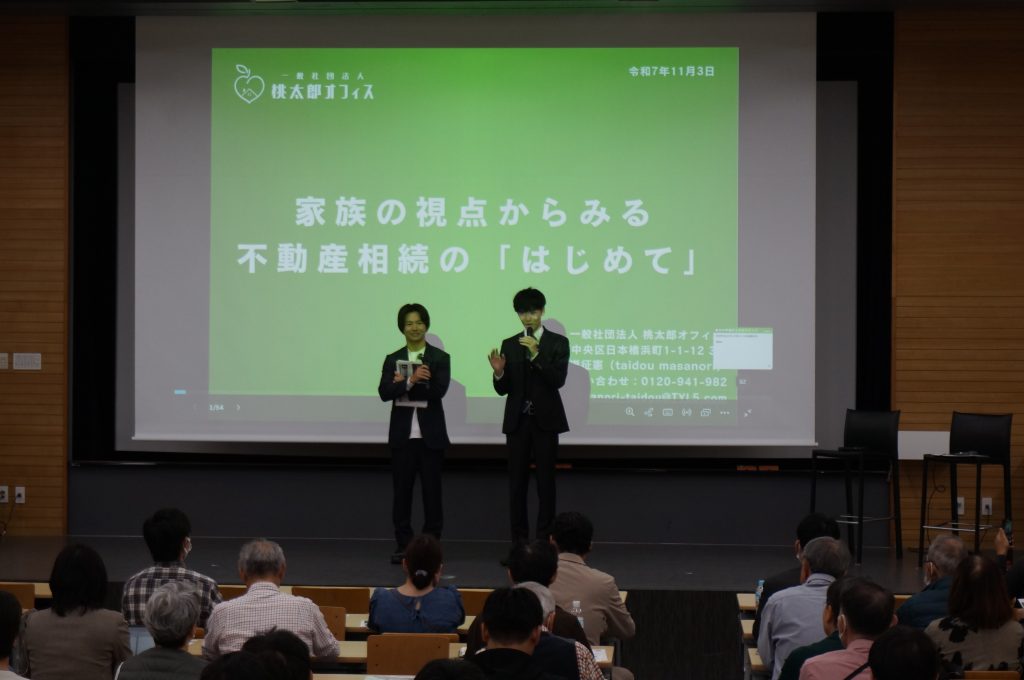 2025年11月3日に2025年明海祭において、公開講演会「桃太郎オフィス(中瀬 桃太郎氏、泰道 征憲氏)10:30~12:00」が開催されました。「桃太郎オフィス(中瀬 桃太郎氏、泰道 征憲氏)10:30~12:00」では、不動産鑑定士の観点からの相続に関する講演がありました。