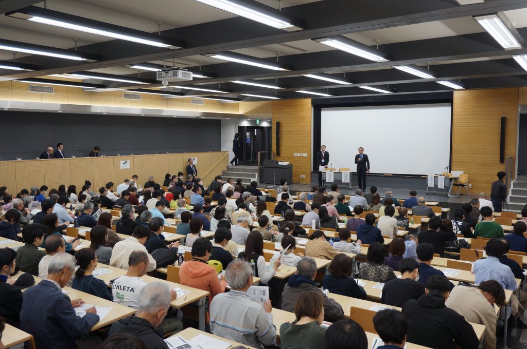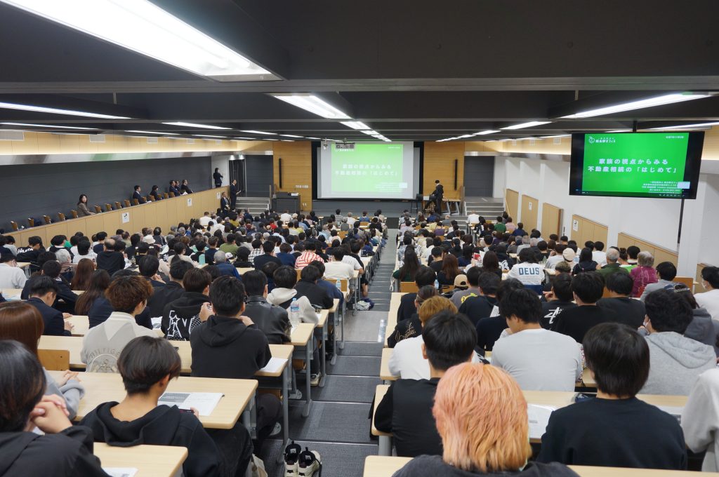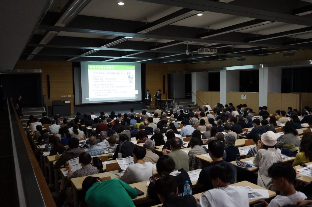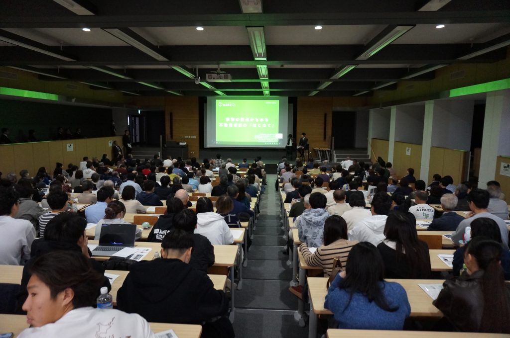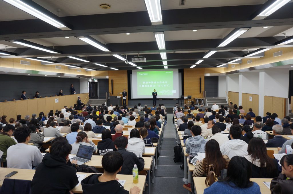 会場には、約450人が参加しました。加えて、別室では、遠隔聴講する学生も数多く参加するなど、熱い講演会でした。公開講演会は、不動産学部学部長の中城康彦先生のご挨拶を始めて、桃太郎オフィス(中瀬 桃太郎氏、泰道 征憲氏)の討論式の講演会が実施されました。公開講演後には、不動産学部の山本卓先生と小松広明先生がフロアからの質問を集めて公開質疑応答の時間を設けるなど、非常に有益な公開講演会でした。