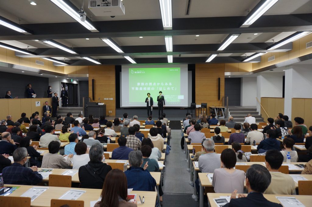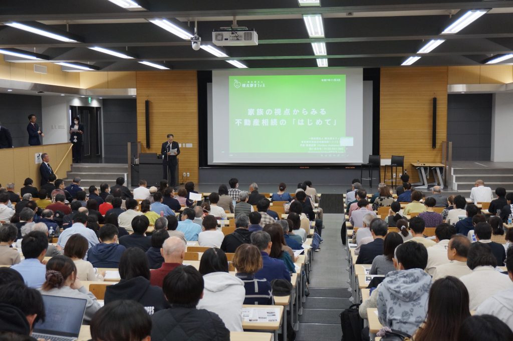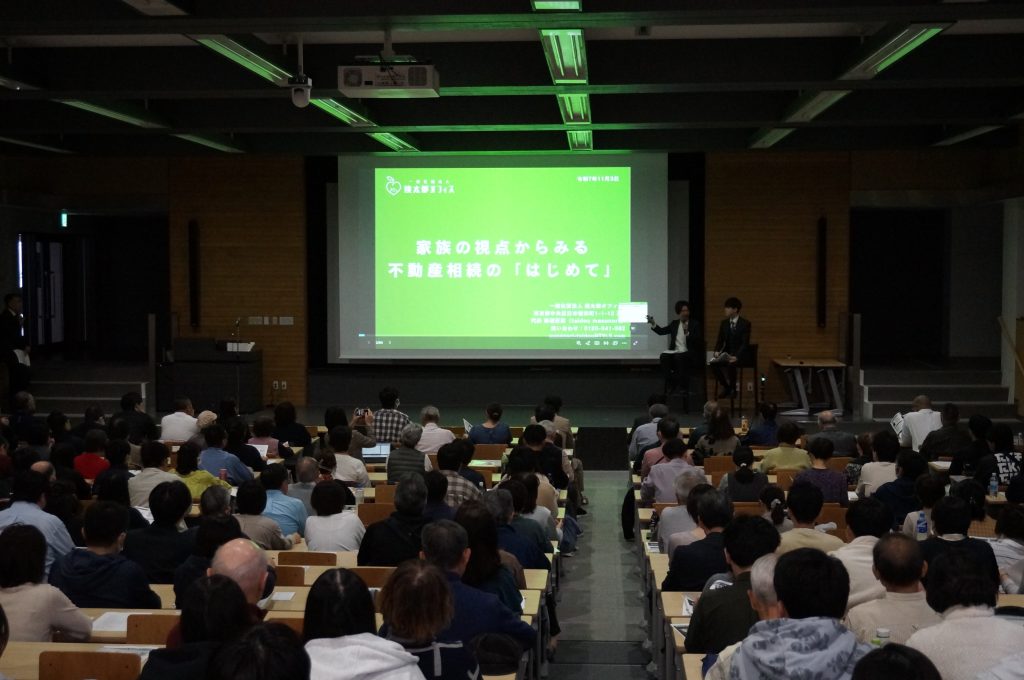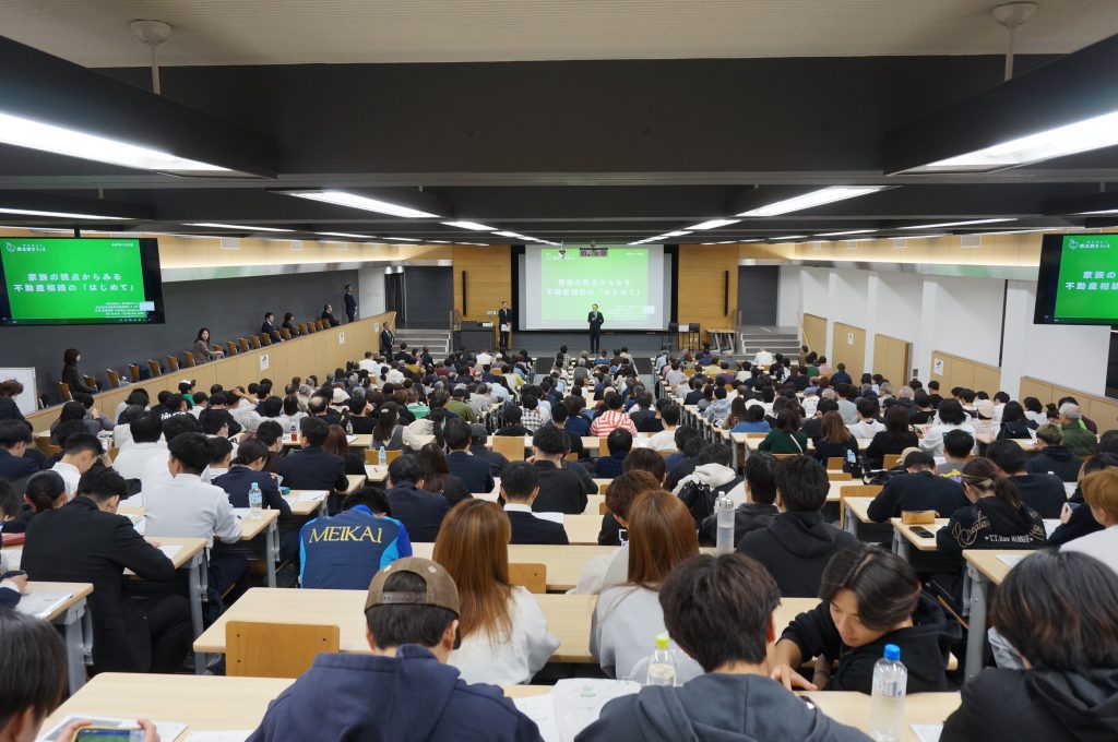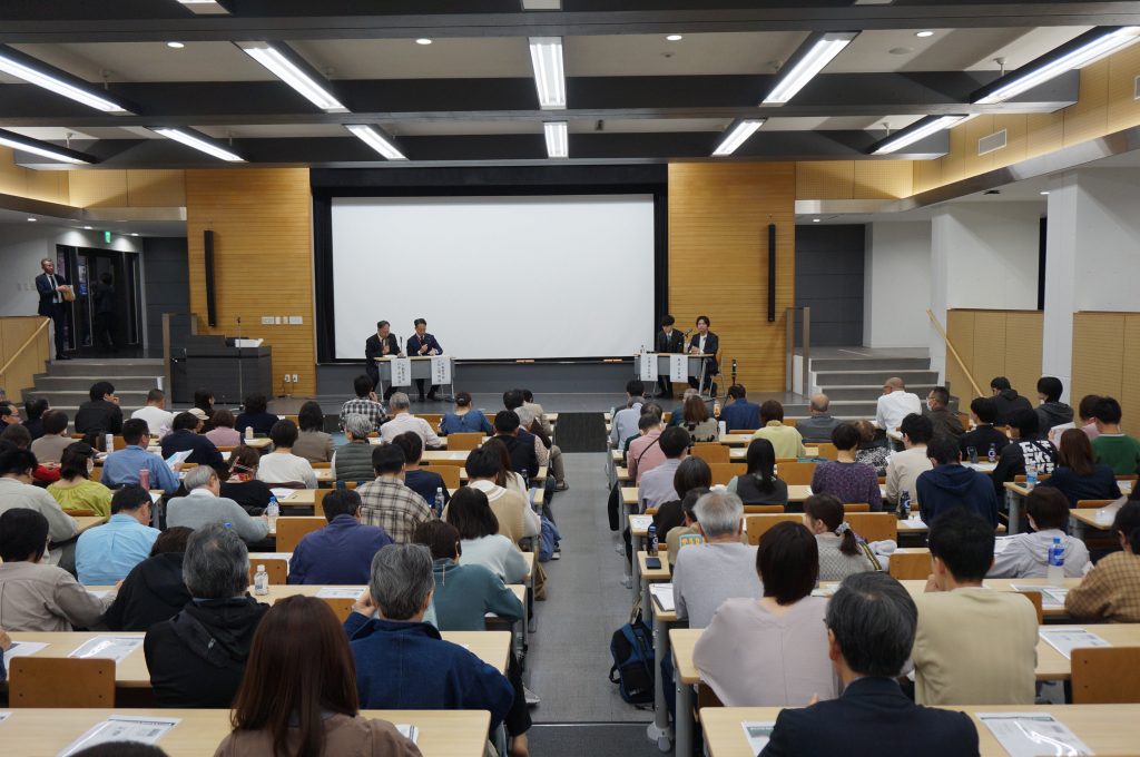 会場には、約450人が参加しました。加えて、別室では、遠隔聴講する学生も数多く参加するなど、熱い講演会でした。公開講演会は、不動産学部学部長の中城康彦先生のご挨拶を始めて、桃太郎オフィス(中瀬 桃太郎氏、泰道 征憲氏)の討論式の講演会が実施されました。公開講演後には、不動産学部の山本卓先生と小松広明先生がフロアからの質問を集めて公開質疑応答の時間を設けるなど、非常に有益な公開講演会でした。